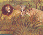 | Sus l'autro ribo, s'estendié uno vasto plano : l'ermas ! Sahib n'en restè enroucassi. I'avié aqui un group d'animau tras que fièr. Avien la coulour de la terro de l'ermas e èron grand e fort. D'ùni pourtavon uno soumbro creniero autour de la tèsto e dou còu : èro li lioun, li rèi dis animau ! Lou cor de Sahib se meteguè à batre la chamado ; mai, noun poudié assouludamen pas se jougne à-n-éli, car èro encaro un leoupard. | Alor, travessè la ribiero en nadant, sènso se faire vèire, fuiè lou sòu emé si piauto pouderouso e se couchè dins soun trau. L'èr vibravo de calour : avié, davans sis iue de rebat jaune, brun e rouge, e, en imaginacioun, se batié emé lou mai fort di lioun, dins l'estiganço d'èstre soun cap, soun meinadité. |