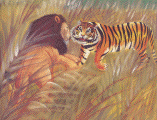 | I'aguè coume d'uiau, davans li iue de Sahib. Se precipitè de tóuti si forço subre Sultan... e uno batesto sauvajo coumencè. Se mourdien e barrulavon sus lou sòu e se mandavon de cop de piauto talamen vióulènt, que si péu voulastrejavon de pertout. Sahib, ié semblavo d'èstre toumba au mitan d'un encèndi. Es qu'au moumen ounte Sultan, coucha au sòu, reclamè la pas, que Sahib remarquè que soun pelage beluguejavo coume l'or e que pau, à-chapau, se curbissié de rego negro, en formo de flamo. D'esperèu, èro redevengu un tigre. | A partir d'aquéu jour, Sahib restè un